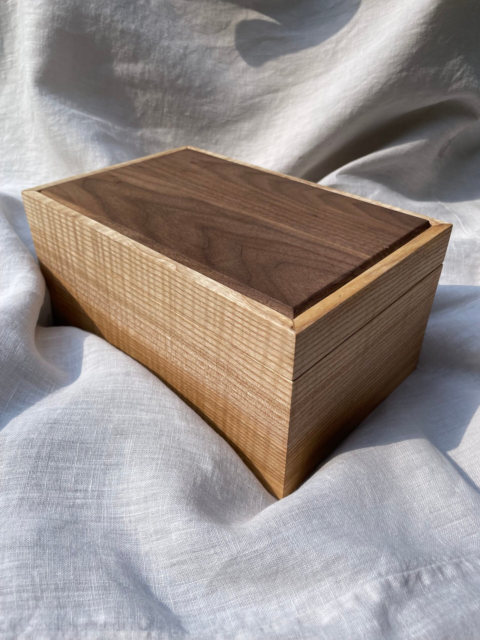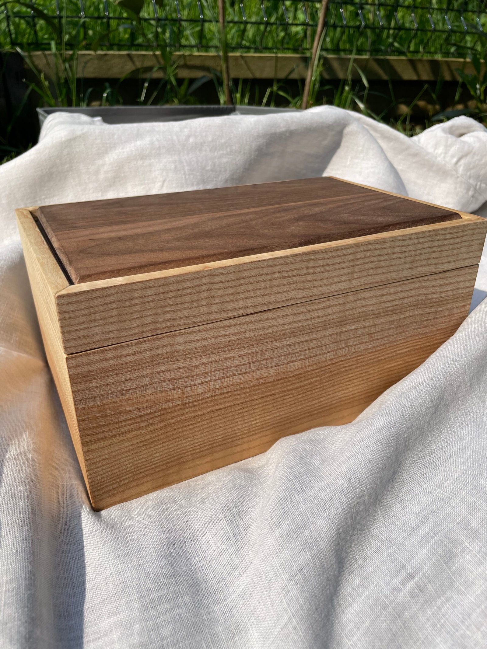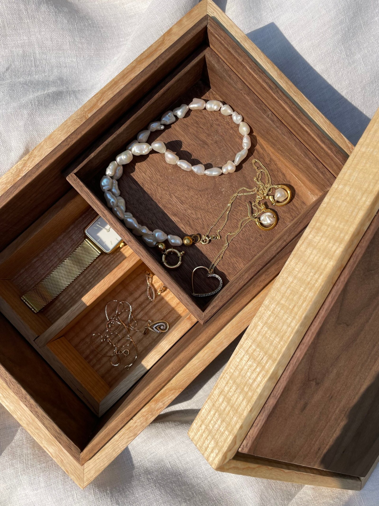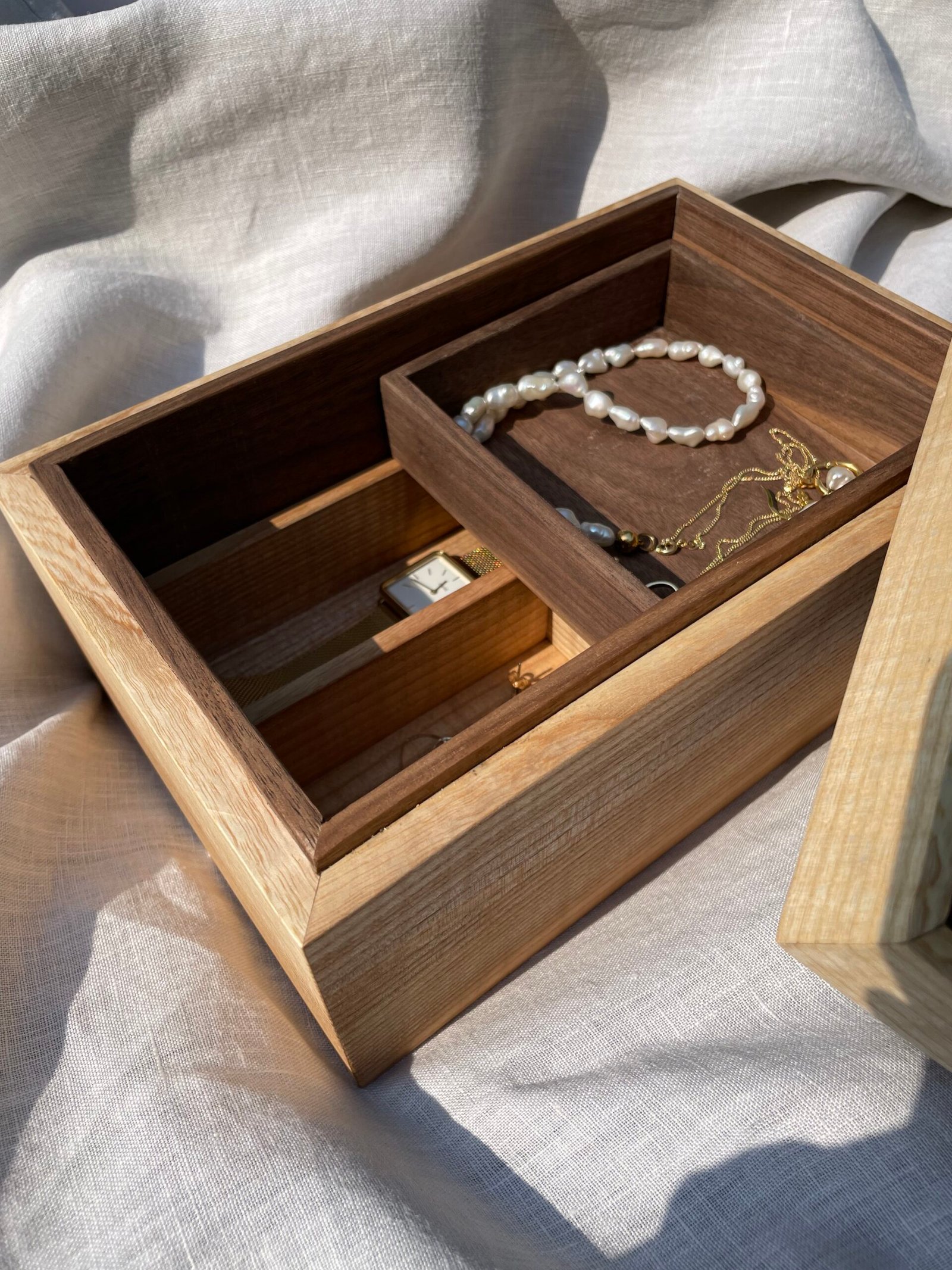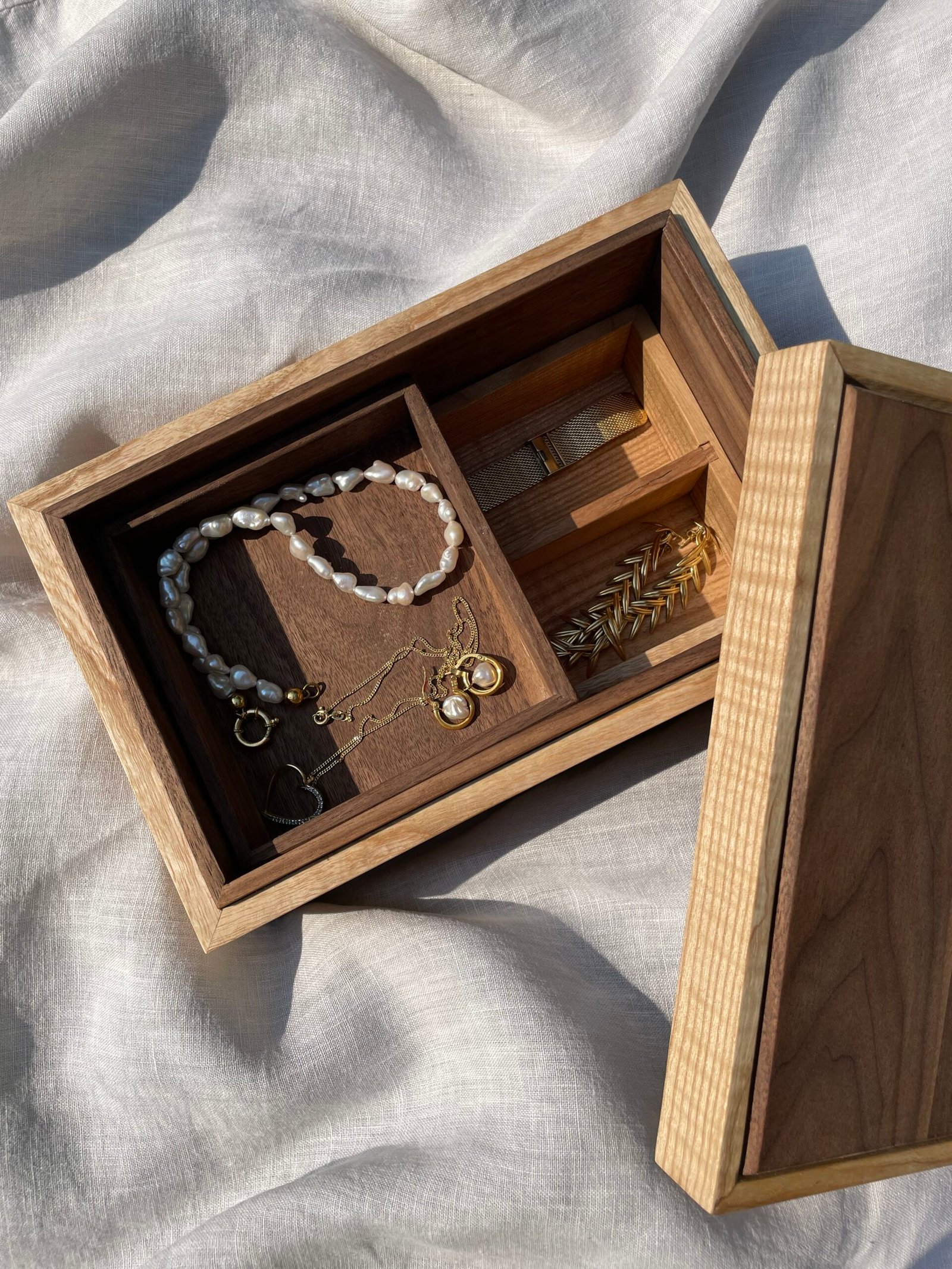 Szkatułka na biżuterię łączy funkcjonalność i ponadczasowy design. Wykonaliśmy ją z dwóch rodzajów drewna – jesionu i orzecha amerykańskiego. Połączenie jasnego i ciemnego odcienia tworzy elegancki kontrast.